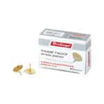 Кнопки канцелярские изготовлены из омеднённой стали. Диаметр шляпки 10 мм, длина острия 7 мм. Упакованы по 100 штук в картонной коробочке.