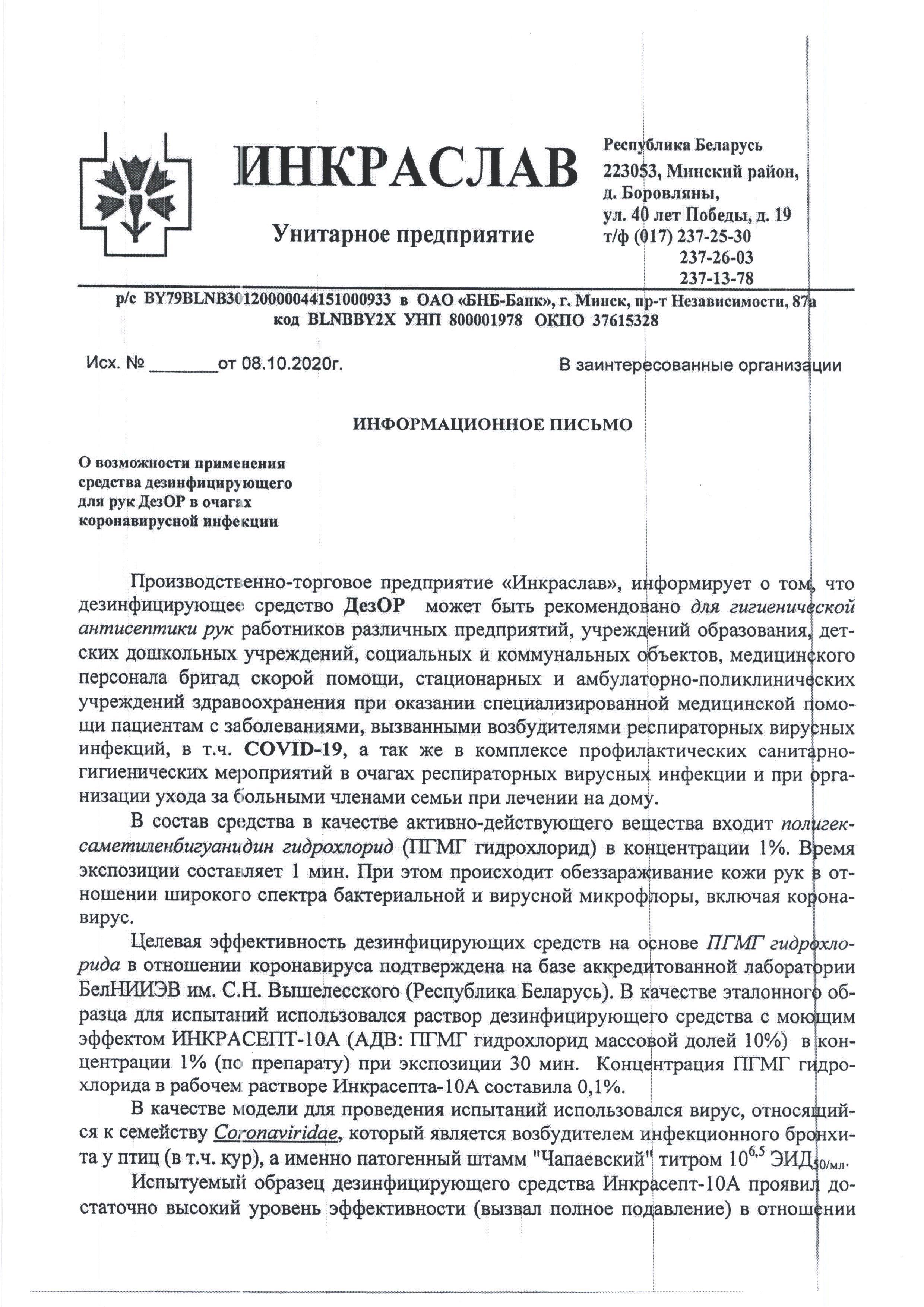 Дезинфицирующее средство для гигиенической обработки рук персонала учреждений здравоохранения и на коммунальных объектах, для работников пищевой промышленности и пищеблоков, для персонала детских дошкольных и школьных учреждений и пр. Не содержит спиртов (полностью на водной основе), ланолина, глицерина. Содержит косметический силикон, защищающий кожу рук от неблагоприятного воздействия вредных химических факторов в процессе работы, особенно при длительной работе в перчатках. Обеспечивает обеззараживающий эффект в течение не менее 3 часов при работе в перчатках. Готовое к применению средство. Время высыхания более длительное, чем у антисептиков на основе спиртов.